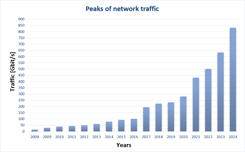 Trend vývoja ročných špičiek agregovaného dátového toku (Gbps): [5]